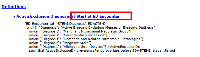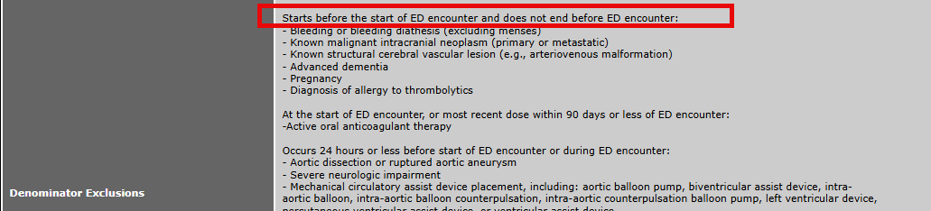 The Denominator Exclusion and Denominator Guidance does not match (refer to the attached). One says starts before ED encounter, the "definition" QRDA logic says at start of ED encounter. This is resulting to an incorrect case outcome of the OP STEMI eCQM.