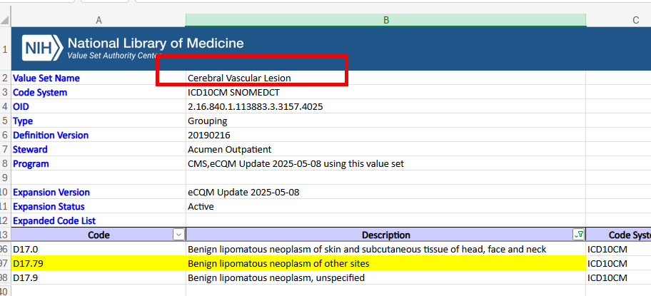 Thank you for your follow-up inquiry regarding CMS996: Appropriate Treatment for ST-Segment Elevation Myocardial Infarction (STEMI) Patients in the Emergency Department (ED). We interpret the intent of the inquiry is to determine why a patient with a D17.79 (Benign lipomatous neoplasm of other sites) ICD-10-CM diagnosis coded as present on admission (POA) was not excluded from the measure denominator. The measure excludes patients with known malignant intracranial neoplasms (primary or metastatic) if the condition starts before the start of the ED encounter and does not end before the ED encounter. The reason the patient was not excluded from the measure denominator is because ICD-10-CM code D17.79 is not captured in the Malignant Intracranial Neoplasm Group value set (OID: 2.16.840.1.113762.1.4.1170.3) that the measure uses for this exclusion. This value set can be found on the Value Set Authority Center (VSAC) [ https://vsac.nlm.nih.gov/valueset/2.16.840.1.113762.1.4.1170.3/expansion/Latest ]. Please note that you may need to create a free account to view these codes. The reason that code D17.79 is not included in the value set is because the measure excludes malignant neoplasms, and code D17.79 indicates a benign neoplasm. The logic in the “Active Exclusion Diagnosis At Start of ED Encounter” definition found in the measure’s HTML file [ https://ecqi.healthit.gov/sites/default/files/ecqm/measures/CMS996-v6.3.000-QDM.html ] excludes conditions that start before the ED encounter and do not end before the ED encounter, in alignment with how the exclusion is described in the HTML header. Please see the following definition below: Active Exclusion Diagnosis At Start Of ED Encounter   "ED Encounter With STEMI Diagnosis" EDwSTEMI     with ( ["Diagnosis": "Active Bleeding or Bleeding Diathesis, Excluding Menses"]       union ["Diagnosis": "Malignant Intracranial Neoplasm Group"]       union ["Diagnosis": "Cerebral Vascular Lesion"]       union ["Diagnosis": "Dementia and Related Intracranial Pathologies"]       union ["Diagnosis": "Pregnant State"]       union ["Diagnosis": "Allergy to thrombolytics"] ) ActiveExclusionDx       such that ActiveExclusionDx.prevalencePeriod overlaps before EDwSTEMI.relevantPeriod The exclusion definition above shows that the diagnosis prevalencePeriod (or time from diagnosis onset to abatement) “overlaps before” the ED encounter relevantPeriod (or the time the encounter began to the time the encounter ended). Meaning, the patient’s diagnosis needs to start before the ED encounter begins for the encounter to be excluded from the measure denominator. Thank you for pointing out the discrepancy between the exclusion definition name in the HTML file and its logic, the measure developer can consider updating the exclusion definition name in a future annual update.