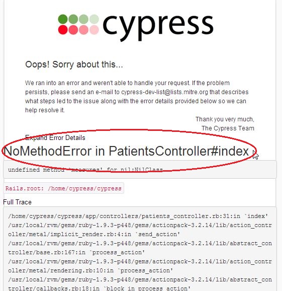 receive error "NoMethodError in PatientsController#index" when click "Master Patient List" button and also i was unable to add Tests. In Tests Entry screen "Measurement Period" and "Build Version" Dropdown data is not populated.