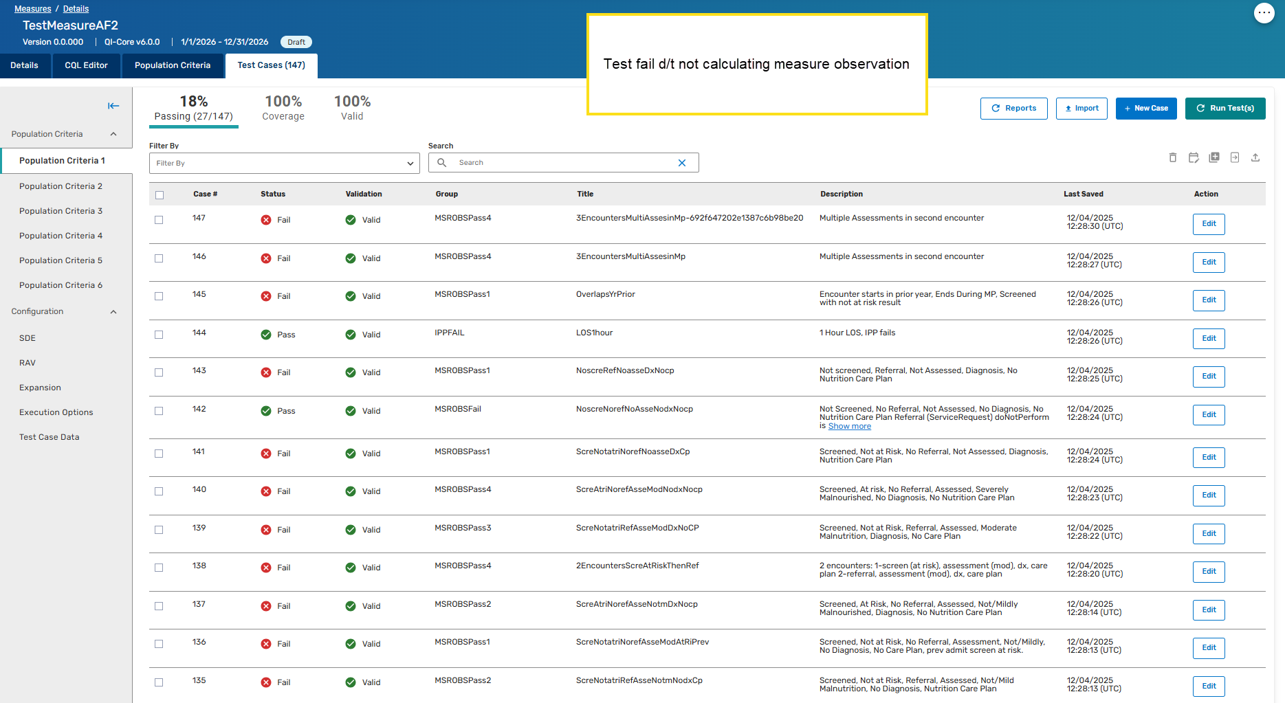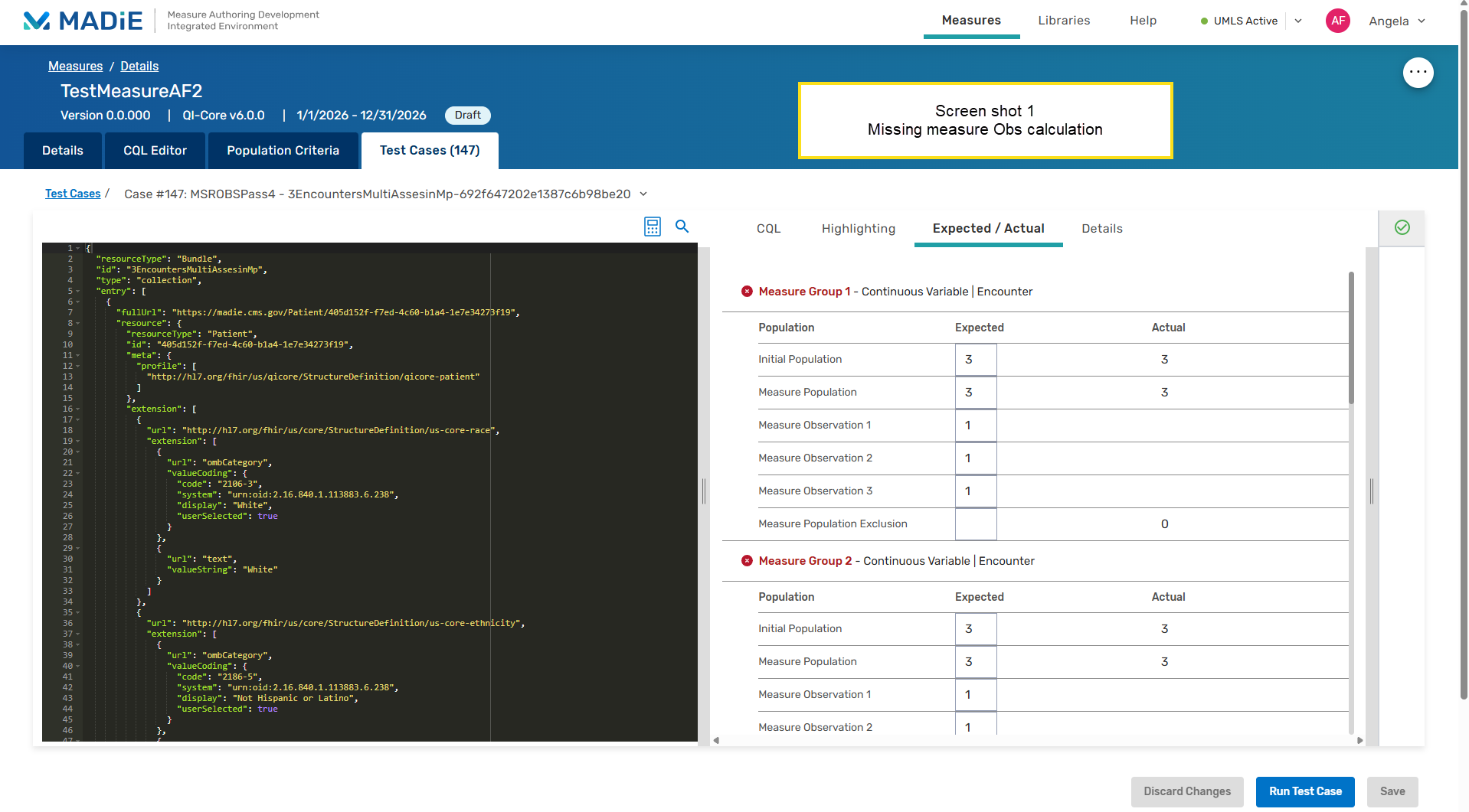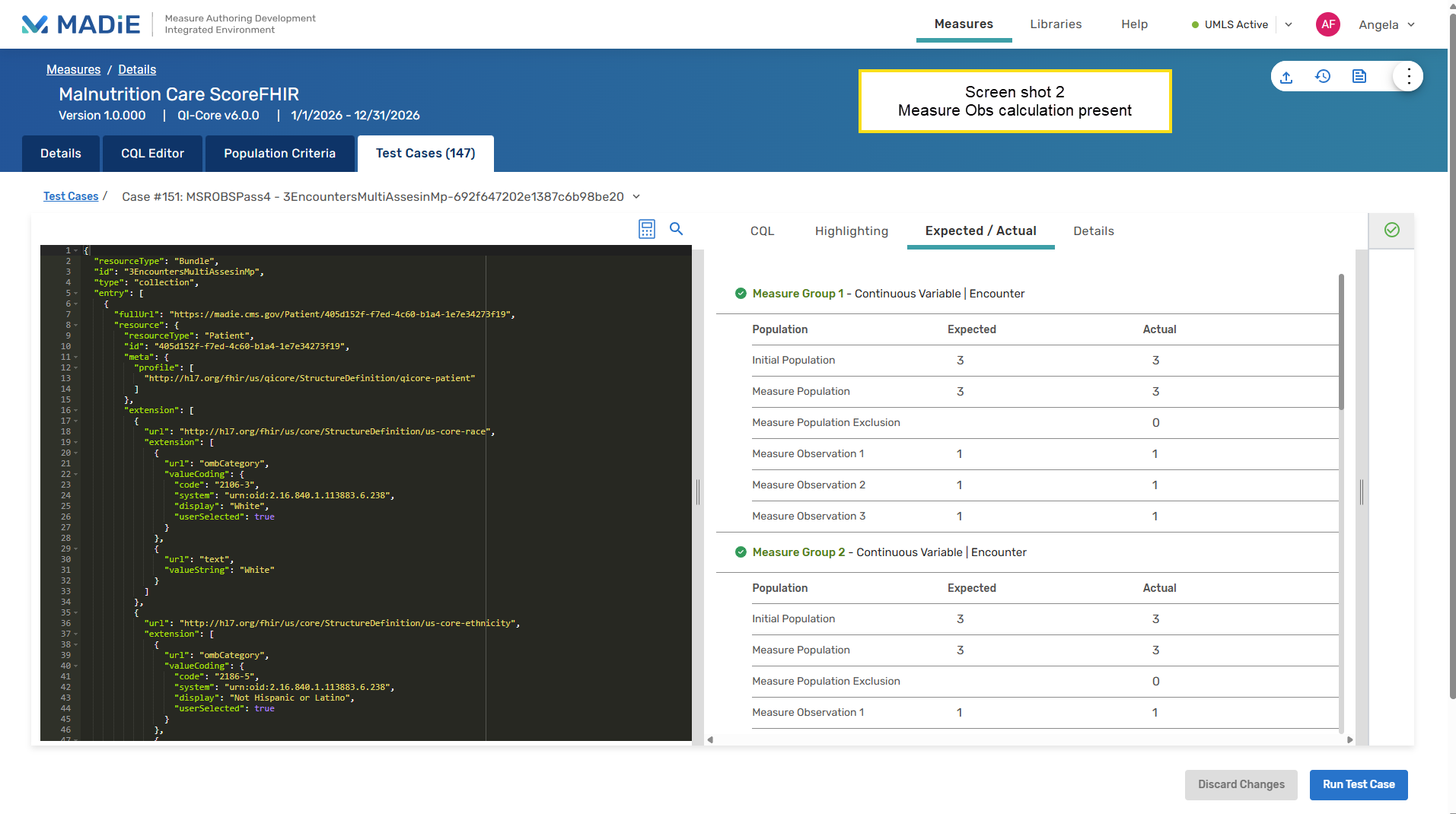 Attempting to evluate the Malnutrtion Measure (CMS 986FHIR) by copiing it into a test measure but in the test measure, the measure test results are different. In TestMeasureAF, the current logic was deleted and logic copied directly from the Malnutrution measure CQL Editor was pasted in, Population Criteria tab was revised to match the critieria in the Malnutrition measure, test cases were deleted and a few selected tests were copied from the actual measure to the TestMeasureAF using the function within MADiE. In TestMeasureAF, this results in no calcuation of the measure observation criteira, see screenshot 1. Screen shot 2 shows, same test case (different #s d/t copying using MADiE tool) with measure observation calculation.