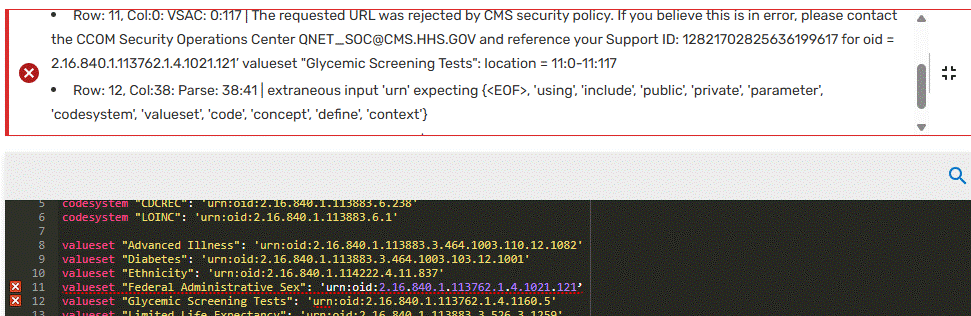 Row: 11, Col:0: VSAC: 0:117 | The requested URL was rejected by CMS security policy. If you believe this is in error, please contact the CCOM Security Operations Center QNET_SOC@CMS.HHS.GOV and reference your Support ID: 12821702825636199617 for oid = 2.16.840.1.113762.1.4.1021.121' valueset "Glycemic Screening Tests": location = 11:0-11:117