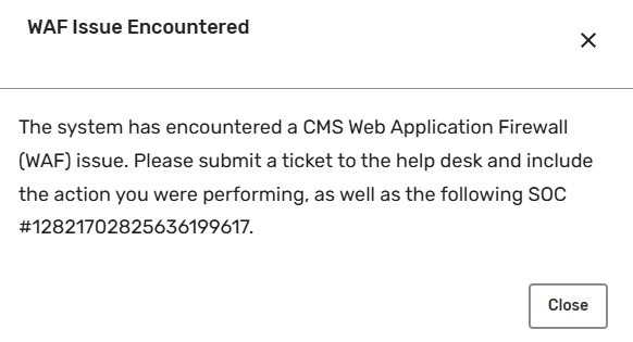 I was updating CQL, specifically valuesets, and when I save my revisions, an error pops up, "WAF Issue Encountered" (image attached). Also there seems to be several errors related to 2 specific value sets: