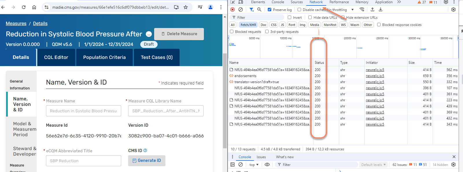 Hi Chandra, Thanks for your quick response. This issue has been happening for me across multiple measures/libraries, but I updated the ticket with the name of one of the draft CQL libraries that I've been working on for reference. 1.) What browser are you using? All statuses are "200." |
