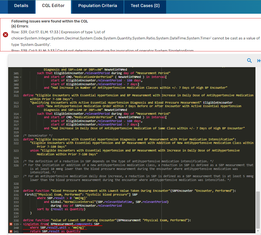 Hi Hayley, The team is looking into your reported issue. You indicated that you are receiving the generic error message "Errors found within the CQL." when trying to make any number of changes/updates to the CQL. Are you receiving any other messages when you are trying to make updates, or is it always this generic error? Additionally, I appreciate the measure example you provided. Can you provide some of the additional measure names where you receive this error. It might be helpful to see similarities between the impacted measures. |